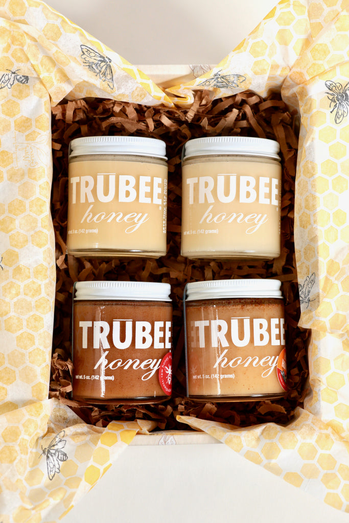 This set comes with one of each of our creamed honeys packaged together in a printed flip-top gift box and a wooden tasting spoon.