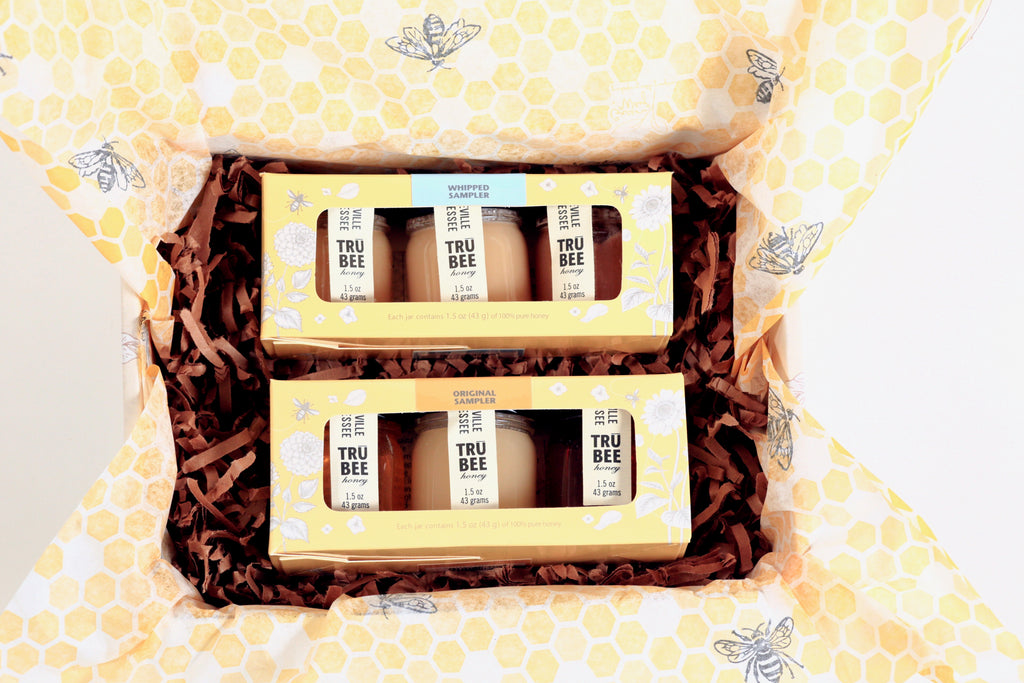 This gift box has one of each of our Mini Samplers. The original sampler has a jar each of our Wildflower Summer, Snow and Barrel Aged and our whipped sampler has a jar each of our Snow, Cinnamon Snow and Lavender Snow